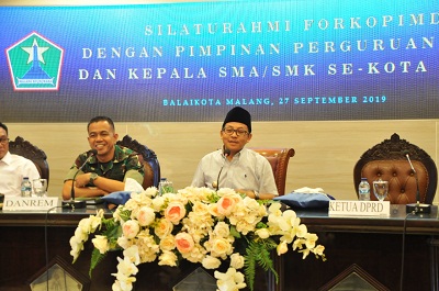 KOTA MALANG,- Danrem 083/Baladhika Jaya, Kolonel Inf Zainuddin mendatangi Ruang Sidang, Balai Kota Malang. Jumat, 27 September 2019. Bukan tanpa sebab, kedatangan orang nomor satu di tubuh Makroem itu, bertujuan untuk menghadiri acara silaturahmi dengan Walikota Malang, Drs. H. Sutiaji dengan seluruh Kepala Sekolah SMA/SMK dan pimpinan Perguruan Tinggi se-Kota Malang.“Kegiatan ini merupakan sarana untuk silaturahmi dan sebagai wujud sinergitas antara TNI, Polri, Rektor dan Kepala Sekolah se-Kota Malang,” ujar Danrem. “Acara ini digelar, dengan tujuan agar terciptanya kondisi yang guyub, rukun, aman dan kondusif,” imbuh Kolonel Zainuddin.