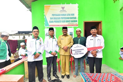 Bupati Karimun , Aunur Rafiq , didampingi Baznas Kabupaten Karimun , menyerahkan rumah layak huni kepada seorang warga yang bermukim di Kelurahan Baran Timur , Kecamatan Meral.