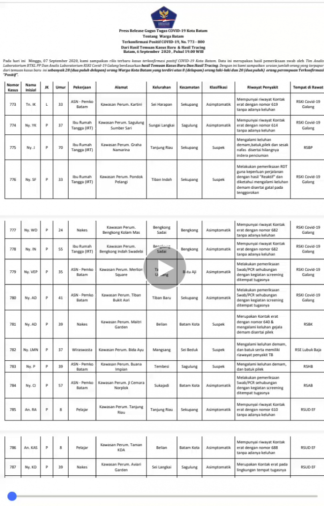 ” Data ini merupakan hasil pemeriksaan swab oleh Tim Analis Laboratorium BTKL PP Dan Analis Laboratorium RSKI Covid-19 Galang berdasarkan hasil Temuan Kasus Baru Dan Hasil Tracing. Dengan ini kami sampaikan uraian jumlah orang yang terpapar dari temuan kasus baru ini sebanyak 28 (dua puluh delapan) orang Warga Kota Batam yang terdiri atas 8 (delapam) orang laki-laki dan 20 (dua puluh) orang perempuan Terkonfirmasi Positif ”.Diuraikan sesuai dengan release gugus tugas Covid-19 Kota Batam bidang kesehatan.