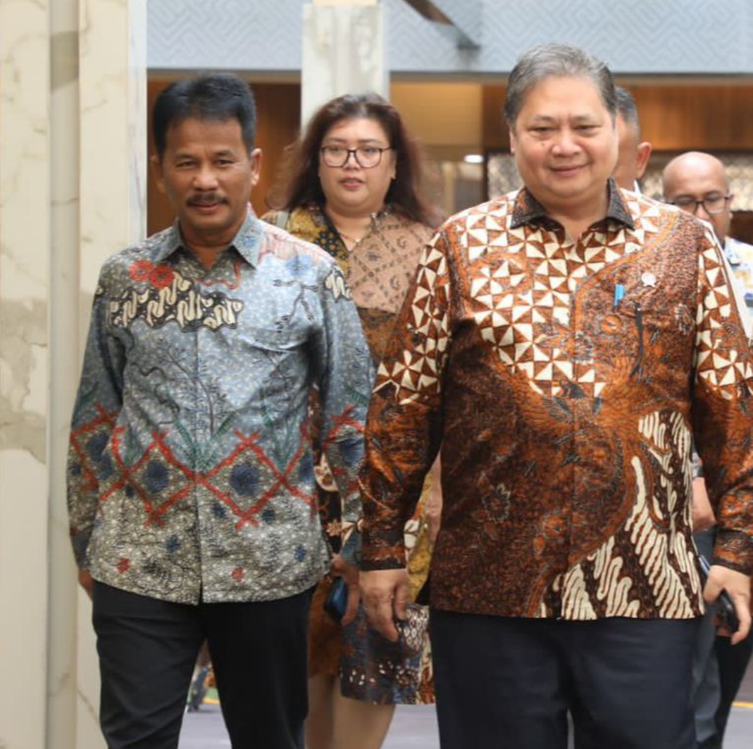 Bersama Anggota Bidang Pengelolaan Kawasan dan Investasi BP Batam, Sudirman Saad, Muhammad Rudi melaporkan perkembangan terkini kepada Menteri Koordinator Bidang Perekonomian RI, Airlangga Hartarto, dalam rapat Progres Pengembangan Kawasan Rempang Eco-City, Rabu (12/7/2023).