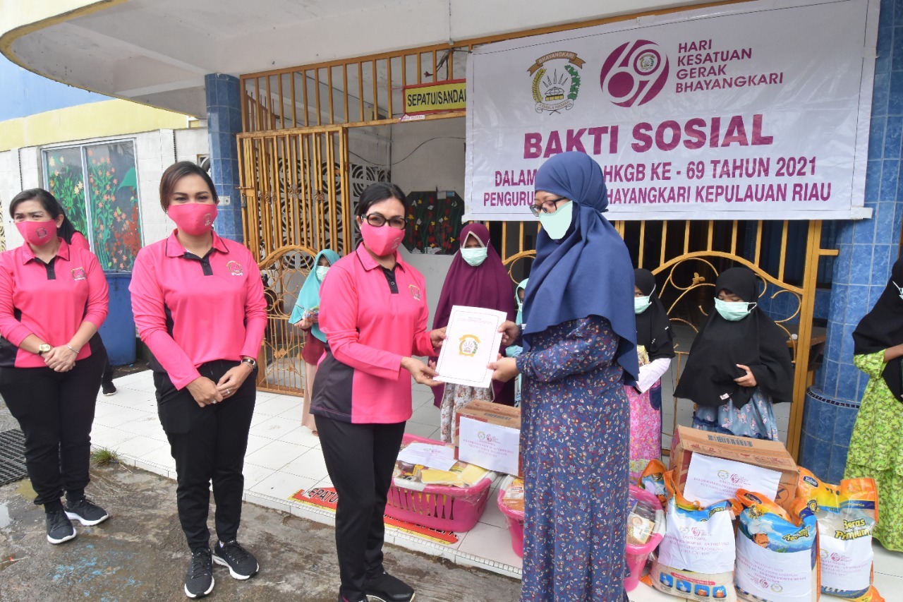 ″Hari ini kita mengadakan Bakti Sosial dalam rangka HKGB ke – 69 tahun 2021, Bakti sosial berupa penyerahan Paket sembako di Panti Asuhan Damai Sejahtera, Batu Aji, Panti Asuhan Al-Hidayah Sei Harapan, Sekupang, Panti Asuhan Daarut Thaybah, Sekupang dan kepada warga di Tanki 1.000, Batu Ampar Kota Batam″. Tutur Ketua Bhayangkari Daerah Kepri Ny. Sinche Aris Budiman.