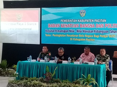 PACITAN,- Kepala Staf Kodim 0801/Pacitan, Mayor Inf Tomi Fedi Anugrahan memberikan pembekalan mengenai wawasan kebangsaan ke para siswa SMAN Punung, Kabupaten Pacitan, Jawa Timur.