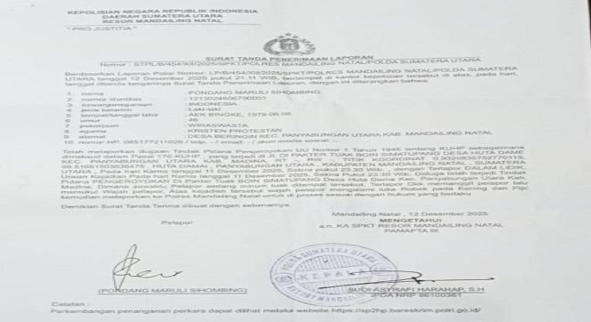 Laporan Polisi yang mereka buat bernomor STPL/B/454/XII/2025/SPKT/Polres Madina /Polda Sumatera Utara diterima oleh IPDA Budi Asyrafi Harahap.Dalam LP ini dituangkan tindak pidana pengeroyokan sebagaimana diatur dalam UU nomor 1 Tahun 1946 tentang KUHP sebagaimana dimaksud dalam Pasal 170 KUHP