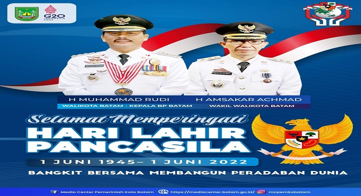 Batam,potretkepri.com- Wali Kota Batam Muhammad Rudi dan Wakil Walikota Batam Amsakar Achmad mengucapkan selamat memperingati Hari Lahir Pancasila tahun 2022.