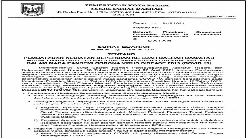 Pemko Batam Terbitkan Surat Edaran untuk Pembatasan ASN Bepergian ke Luar DaerahBatam|14 April 202114 April 2021oleh Redaksi