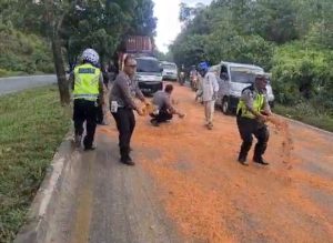 Sejumlah anggota Satlantas dibantu warga melakukan tindakan ,menyiramkan pasir ke jalan aspal