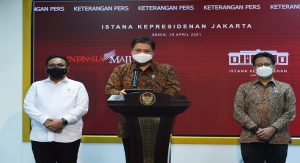Menko Perekonomian Airlangga Hartarto didampingi Menag Yaqut Cholil Qoumas dan Menkes Budi