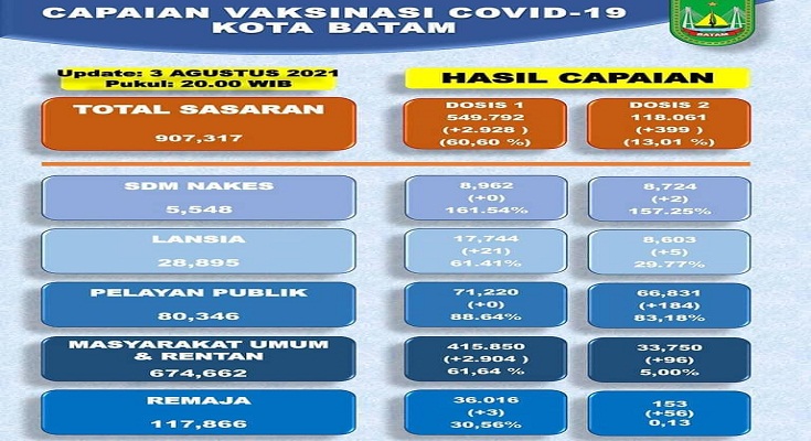 Batam,potretkepri.com – Pemerintah Kota (Pemko) Batam mendata, sebanyak 549.792 warganya sudah divaksin