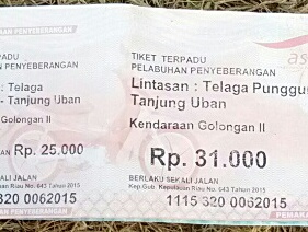 Dalam tiket terpadu pelabuhan penyeberangan , lintasan pelabuhan , Telaga Punggur – Tanjung Uban tertulis harga tiket untuk kenderaan golongan II sebesar Rp.31.000; dan biaya ongkos per satu orang adalah sebesar Rp.20.000;.