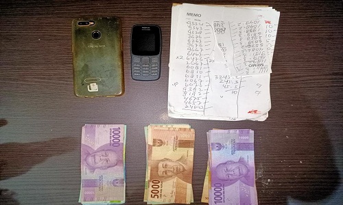 Adapun barang bukti yang didapat dari Sdr. P (Bandar – Pengepul) dan Sdr. Nasrul (Agen) yaitu 1 buku rekapan berisi angka, uang Rp. 300.000 (Tiga ratus rupiah), 1 buah pulpen, 1 unit handphone merek Oppo warna hitam dan 1 unit handphone Nokia warna hitam.