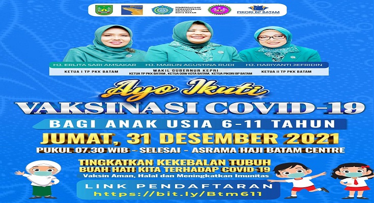Batam,potretkepri.com – Tim Penggerak PKK Kota Batam bekerjasama dengan Dinas Kesehatan (Dinkes) Kota Batam, Gabungan Organisasi Wanita (GOW) Kota Batam dan Persatuan Istri Karyawan BP Batam (PIKORI BP Batam) akan menggelar vaksinasi massal anak, pada Jumat 31 Desember 2021 di Asrama Haji Batam.