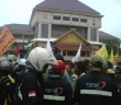 Ratusan anggota polisi bersiaga untuk mengamankan jalannya demo .mereka berdiri dengan berhadap hadapan dengan ribuan buruh yang sedang menyampaikan aspirasinya.
